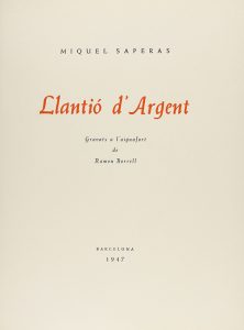 1947. LIBRO: (BIBLIOFILIA). SAPERAS, MIQUEL: LLANTIÓ D´ARGENT. Barcelona: Altés, 1947. 4º menor. 150 p.,1 h. 6 aguafuertes de Ramon Borrell, 5 en lámina y uno en texto. Ejemplar en rama. Intonso. En rama, presentado...