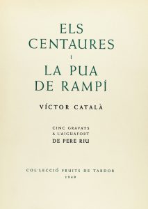 1949. LIBRO: (BIBLIOFILIA). CATALÀ, VICTOR: ELS CENTAURES I LA PUA DE RAMPÍ. Prólogo del autor. Grabados al aguafuerte de Pere RIU. Barcelona: Fruits de Tardor; Imp. Tallers Electra, 1949. 4º. 41 p. Ilustr. con 5...