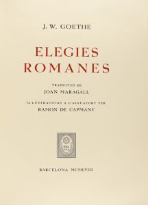 1958. LIBRO: (BIBLIOFILIA). GOETHE, J.W.; CAPMANY [ilustrador]: ELEGIES ROMANES. Traducción de Joan Maragall. Barcelona-Sabadell: Hora Luen-Sallent, 1958. Folio. Ilustr. con 22 aguafuertes de Ramón de Capmany, y una...