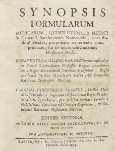 1749. LIBRO: (MEDICINA-CIRUGIA). MILANS, BONAVENTURA; ROSELL, CAROLUS VINCENTIUS: SYNOPSIS FORMULARUM MEDICARUM, QUIBUS UTUNTUR MEDICI IN GENERALI BARCINONENSI NOSOCOMIO, quas studiose selectas, propriamque, experientia...