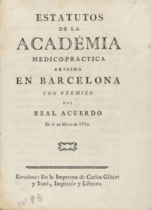 1770. LIBRO: (MEDICINA). ESTATUTOS DE LA ACADEMIA MEDICO-PRACTICA ERIGIDA EN BARCELONA CON PERMISO DEL REAL ACUERDO DE 4 DE MAYO DE 1770. Barcelona: Imp. Carlos Gibert y Tutó, imp. y libr., 1770. 8º mayor. 32 p. Sin cubiertas....