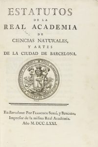 1771. LIBRO: (CIENCIAS). ESTATUTOS DE LA REAL ACADEMIA DE CIENCIAS NATURALES, Y ARTES DE LA CIUDAD DE BARCELONA. Barcelona: Francisco Suriá y Burgada, 1771. 8º mayor. 2 h., 69 p., 1 h. Frontispicio grabado por P. Molas, portada...