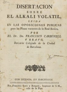 1790. FOLLETO: (FARMACIA). CARBONELL, FRANCISCO: DISERTACION SOBRE EL ALKALI VOLATIL LEIDA EN LAS OPOSICIONES PUBLICAS PARA LAS PLAZAS VACANTES DE LA REAL BOTICA. Barcelona: Francisco Suria y Burgada, 1790. 8º. 30 p. Sin...