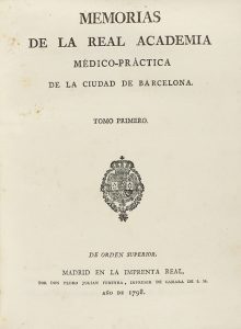 1798. LIBRO: (MEDICINA). MEMORIAS DE LA REAL ACADEMIA MÉDICO-PRÁCTICA DE LA CIUDAD DE BARCELONA. Madrid: Imp. Julian Pereyra, 1798. 4º menor. 3 h. + LXIV655 p. y 2 lám. plegadas, una de ellas con la partitura de varias...