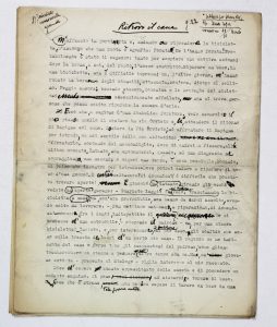 Dattiloscritto e correzioni a inchiostro nero. 9 Pagine. Dimensioni: 290x230 mm. SI AGGIUNGONO: Id., 1 lettera, 1cartolina viaggiata autografa firmata e 1 carta firmata “Calabrone”. Datate 1942 e 1944. Manoscritti a inchiostro nero. Le carte con timbro a secco di Bartolini. La cartolina con timbro a inchiostro dell’incisore e la scritta “Vinceremo”. Fori di raccoglitore. Dimensioni varie. SI AGGIUNGE: Cardazzo Carlo, Lettera dattiloscritta con firma autografa. Datata 21 gennaio 1944. Dattiloscritto a inchiostro blu su carta intestata “Galleria d’arte del Cavallino / Venezia”. SI AGGIUNGE: Id., Meccanico gigante. Venezia: Maddalena, 1939. Con restauri al dorso e fogli di guardia rinnovati. I DOCUMENTO: Bartolini è ritenuto tra i migliori incisori italiani contemporanei. La sua attività si estese anche alla pittura e alla scrittura. L’incipit del suo racconto è il seguente: «M’affaccio in portineria e, andando a riprendere la bicicletta, m’accorgo che una ruota è sgonfia. Forata. Me l’hanno forata! Probabilmente è stato il ragazzo: tanto per compiere una cattiva azione […]». II DOCUMENTO: Nella cartolina Bartolini scrive: «Va da Cardazzo (Galleria del Cavallino) e domandagli se ha ricevuto le 20 acqueforti che mi richiese e che gli mandai […]. Altrimenti dovrò iniziare le solite ricerche postali, come ho dovuto fare con esito fortunatamente favorevole, per altre acqueforti spedite a Torino, a Vienna, a Milano […]». III DOCUMENTO: Cardazzo conferma di aver ricevuto le incisioni di Bartolini.