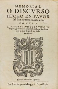 1627. LIBRO: (DERECHO CATALÁN-BRUGALLA). MEMORIAL O DISCURSO HECHO POR EL PRINCIPADO DE CATHALUÑA EN RESPUESTA DE OTRO HECHO POR LA VILLA DE PERPIÑAN EN SU NOMBRE, Y DE LOS CONDADOS DE ROSSELLON, Y CERDAÑA, SOBRE LA DESUNION Y...