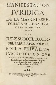 1693. LIBRO: (DERECHO ECLESIÁSTICO). MANIFESTACION IURIDICA DE LA MAS CELEBRE, Y CIERTA PREROGATIVA QUE HA DEFENDIDO EL TRIBUNAL DEL JUEZ SUBDELEGADO DEL BREVE APOSTOLICO, EN LA PRIVATIVA IURISDICCION QUE MERECIO POR LOS BREVES, O...