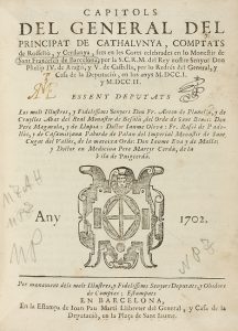 1702. LIBRO: (DERECHO CATALÁN). CAPITOLS DEL GENERAL DEL PRINCIPAT DE CATHALUNYA, COMPRATS DE ROSSELLO, Y CERDANYA, FETS EN LES CORTS CELEBRADES EN LO MONESTIR DE SANT FRANCESCH DE BARCELONA. Barcelona: Estampa de Ioan Pau...