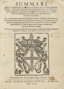 1710. LIBRO: (BARCELONA-DERECHO). SUMMARI DELS CARRECHS, Y OBLIGACIONS DELS COLLIDORS, TAULERS, Ò RECEPTORS DELS DRETS DE LA GENERALITAT DEL PRESENT PRINCIPAT DE CATHALUNYA... [Barcelona]: Casa de Rafel Figuerò, 1712. 8º...
