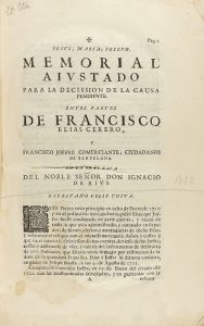 1728. LIBRO: (DERECHO). MEMORIAL AIUSTADO PARA LA DECISSION DE LA CAUSA PENDIENTE ENTRE PARTES DE FRANCISCO ELIAS CERERO, Y FRANCISCO JOFFRE COMERCIANTE, CIUDADANOS DE BARCELONA. Barcelona: s. imp., 1728. 4º mayor. 171 p....