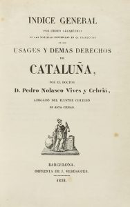 1838. LIBRO: (CATALUÑA-DERECHO). VIVES Y CEBRIÁ, PEDRO NOLASCO: ÍNDICE GENERAL POR ÓRDEN ALFABÉTICO DE LAS MATERIAS CONTENIDAS EN LA TRADUCCION DE LOS USAGES Y DEMAS DERECHOS DE CATALUÑA. Barcelona: Imp. J....