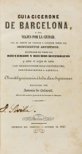 1847. LIBRO: (BARCELONA-GUIA). BOFARULL, ANTONIO: GUIA-CICERONE DE BARCELONA O SEA VIAJES POR LA CIUDAD... Barcelona: Imp. del Fomento, 1847. 8º. Mapa plegado. Enc. en pasta española, cortes pintados. *B03-17.