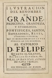 1638. LIBRO: TAPIA I ROBLES, JUAN ANTONIO: ILUSTRACION DEL RENOMBRE DE GRANDE. PRINCIPIO, GRANDEZA Y ETIMOLOGIA. PONTIFICES, SANTOS, EMPERADORES, REYES, I VARONES ILUSTRES, QUE LE MERECIERON EN LA VOZ PUBLICA DE LOS HOMBRES AL...