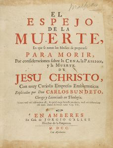 1700. LIBRO: (RELIGON-GRABADOS). BUNDETO, CARLOS: EL ESPEJO DE LA MUERTE EN QUE SE NOTAN LOS MEDIOS DE PREPARARSE PARA MORIR, POR CONSIDERACIONES SOBRE LA CENA, LA PASSION, Y LA MUERTE DE JESU CHRISTO. Amberes: casa de...