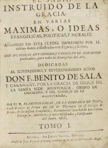 1703. LIBRO: (HUMANIDADES). SALA, BENITO DE: EL SABIO INSTRUIDO DE LA GRACIA EN VARIAS MAXIMAS, O IDEAS EVANGELICAS, POLITICAS Y MORALES. TOMO I. Barcelona: Joseph Llopis, 1703. 8º mayor. 8 h. + 576 p. Viñetas. Corto de...