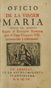 1752. LIBRO: (RELIGION). OFICIO DE LA VIRGEN MARIA DESPUES DE ADVIENTO. Amberes: Archi-emprenta Plantiniana, 1752. 12º. 231 p. Texto a dos tintas. Bella enc. de época en plena piel roja, lomo y planos decorados, cortes dorados....