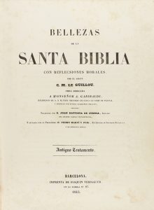 1845. LIBRO: GUILLOU, M. LE: BELLEZAS DE LA SANTA BIBLIA CON REFLECSIONES MORALES. Barcelona: Imp. de Joaquin Verdaguer, 1845. 2 vols. en 4º. I. Antiguo Testamento: IV + 109 p., 40 láms.; II. Nuevo Testamento. 110 p., 36 láms....