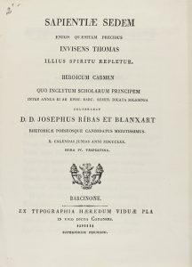 S. XIX. LIBRO: CONJUNTO DE 5 DOCUMENTOS PUBLICADOS SOBRE SANTO TOMAS DE AQUINO. Un estudio de Josepho de Bahy de Ribor; Funciones de religion y de letras... Sapientiae sedem enixis quaesitam precibus... y 2 goig.