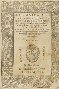 sos descendents. Feta per lo mamgnifich en Ramon Muntaner, lo qual servi axi al dit Inclyt Rey don Iaume com a sos fills, e descendents : es troba present a les coses contengudes en la present historia. Barcelona: en casa de Iaume Cortey Librater, 1562. Folio. 14 h. (incluida bella portada decorada con grabados en madera representando figuras mitológicas y el escudo del impresor en el centro), 248 fols. Capitales xilografíadas. Texto con apostillas marginales. La portada está parcialmente remontada, últimos folios con las puntas restauradas y cerco de humedad en los primeros. Enc. en su pergamino original con el lomo rotulado. Impresión de Barcelona tan rara como la de la edición original, hecha cuatro años después para paliar la escasez de ejemplares, y que reproduce a plana y renglón el texto original, variando tan solo en la dedicatoria. Corrobora así Salvá, II, 3076: «Esta segunda edición es también muy rara». Esta crónica es uno de los pilares más sólidos de la historia de Cataluña. *B06-20.