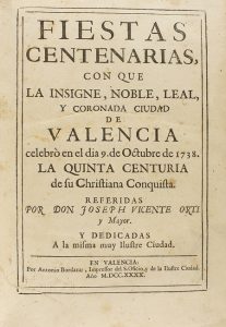 1740. LIBRO: (VALENCIA). FIESTAS CENTENARIAS CON QUE (...) LA CIUDAD DE VALENCIA Celebro En El Dia 9 De Octubre De 1738 La Quinta Centuria De Su Christiana Conquista. Valencia: Imp. S. Oficio, 1740. 8º mayor. Un grabado + 36 h.,...