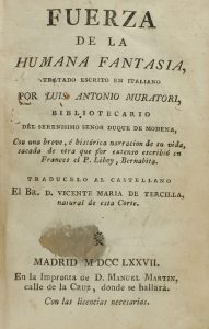 1777. LIBRO: MURATORI, ANTONIO: FUERZA DE LA HUMANA FANTASIA, TRATADO ESCRITO EN ITALIANO. Madrid: Manuel Martin, 1777. 8º menor. 6 h. + XXXVI + 1 p. + 362 p. Enc. en plena piel, tejuelo. *M11-20.