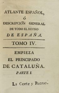 1781. LIBRO: (HISTORIA-CATALUNYA). ESPINALT Y GARCIA, BERNARDO: ATLANTE ESPAÑOL Ó DESCRIPCION GENERAL DE TODO EL REYNO DE ESPAÑA. TOMO IV. Madrid: Imp. Antonio Fernandez, 1781. 8º menor. Un mapa, 4 h., 373 p. y un...