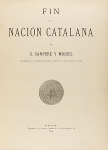 1905. LIBRO: (CATALUNYA). SANPERE Y MIQUEL, S.: FIN DE LA NACIÓN CATALANA. Barcelona: Tip. L´Avenç, 1905. Fol. menor. VII + 693 p. Enc. en tela. *B01-09.