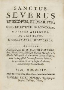 1764. LIBRO: (BARCELONA-BIOGRAFIA). CARESMAR I ALEMANY, JAUME: SANCTUS SEVERUS EPISCOPUS , ET MARTYR, SEDI, EY CIVITATI BARSINONENSI... Vici: Ex-Officina Petri Morera, 1764. 8º. 48 p., 176 p., 16 p. Viñetas, capitales y...