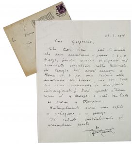 Manoscritto a inchiostro nero su carta con filigrana. Dimensioni: mm 280x215 mm. «[…] ti avverto che devo assentarmi i giorni 2, 3 e 4 marzo, perché ancora impegnato nel comitato consultivo della Biennale di Venezia. Poi dovrò recarmi a Roma il 6 per la seduta alla Accademia dei Lincei, non come socio ma come commissario in una giuria internazionale. Sarò quindi a Torino […]. Naturalmente sarai mio ospite a colazione o a pranzo […]».