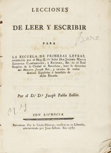 1787. FOLLETO: LECCIONES DE LEER Y ESCRIBIR. Barcelona: viuda Piferrer, 1787. 8º mayor. 53 p. [Sigue:] ESTATUTOS PARA EL GOBIERNO DE LA ESCUELO DEL HOSPICIO. 4 h. Sin cubiertas.