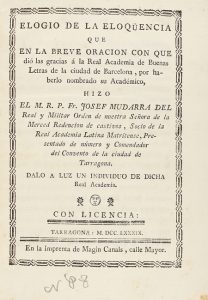 1789. LIBRO: MUDARRA DEL REAL, JOSEF: LIBRO DE LA ELOQUENCIA QUE EN LA BREVE ORACION CON QUE DIO LAS GRACIAS A LA REAL ACADEMIA DE BUENAS LETRAS DE LA CIUDAD DE BARCELONA, POR HABERLO NOMBRADO ACADEMICO. Tarragona: Imp. Magin...