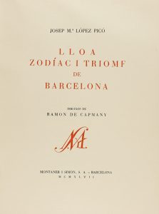 1947. LIBRO: (LITERATURA CATALANA). LÓPEZ-PICÓ, JOSEP MARIA:. LLOA. ZODÍAC I TRIOMF DE BARCELONA. Dibuixos de Ramon de Capmany. Barcelona: Montaner y Simón, 1947. 4º menor. 42 p., 4 láms. en blanco y negro. Impreso a...
