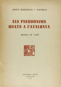1951. LIBRO: (LINGUISTICA-CATALUNYA). RODERGAS I CALMELL, JOSEP: ELS PSEUDONIMS USATS A CATALUNYA. (Recull de 3.800). Barcelona: Editorial Millà, 1951. 4º. XV p. + 408 p. Parcialmente intonso. Rúsica. Ejemplar con lomo...