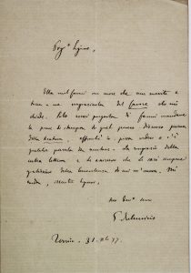 La missiva è scritta da Torino: «[…] tocca a me ringraziarla del favore che mi chiede. […] vorrei pregarla di farmi mandare le prove di stampa di quel povero discorso prima della tiratura affinché io possa vedere se c’è qualche parola da mutare […]».