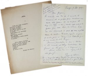 Manoscritto a inchiostro blu su carta intestata “Galleria Santo Stefano […] Venezia”. Busta e francobolli conservati. Dimensioni: 280x220 mm. SI AGGIUNGE: “Esopo”. Brano in versi dattiloscritto a nome di Giorgio De Chirico. Non datato. Dattiloscritto a inchiostro nero con alcune correzioni autografe (?). Dimensioni: 280x220 mm. I DOCUMENTO: Lettera di argomento lavorativo: «[…] si potrebbe forse combinare una mostra nella galleria di cui mi parli. Il luogo (Via Bigli) va bene. Sarebbe meglio certo se la galleria fosse sulla strada, con vetrina. E poi non dici chiaramente in quale mese si potrebbe tenere […]. Parli di “Venezia”; si tratterebbe di una mostra di sole venezie […]. Salutami Borgese che si ostina a non voler accettare i miei inviti a colazione o a cena […]». II DOCUMENTO: Incipit del testo poetico di De Chirico: «Città dei sogni insognati, / costrutte da demoni / con santa pazienza… / voi fedele canterò. / Un dì sarò anch’io un uomo / di sasso. / Sposo vedovo sul sarcofago / etrusco…».