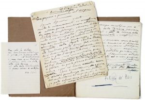 Manoscritto a inchiostro nero e matita grigia. Pagine 38. Con correzioni e cancellature. Dimensioni: 265x225 mm. SI AGGIUNGE: Id., Brano poetico autografo firmato dal titolo “Il piccolo falegname”. Non datato. Manoscritto a inchiostro blu su carta a righe. Dimensioni: 180x135 mm. SI AGGIUNGE: Id., Prose e articoli. Milano: Il Balcone, 1947. I DOCUMENTO: Si tratta di un lungo discorso da tenersi all’Accademia Albertina di Torino. Incipit: «Signore Signori… vedete.. metto le mani avanti e vi confesserò sebbene possa sembrare strano che le conferenze, i discorsi, le letture ecc. ecc. non entrano precisamente nelle mie simpatie. […]». Il discorso è molto articolato. De Pisis tratta la forma, il colore, il disegno, cita e commenta molti autori in svariati campi dell’arte: da Carrà a Debussy, da Pascoli a Morandi, da Cezanne a Boldrini ecc. II DOCUMENTO: Incipit del brano poetico: «Nel tanfo della mia cella / (piove la luce della calda sera / dal triste lucernaio) / il piccolo falegname / pensa al profumo […]».