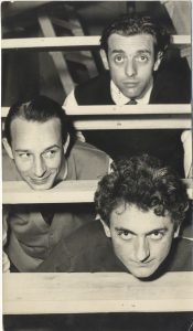 Dimensioni varie. Le fotografie ritraggono gli attori e il futuro Premio Nobel nella rivista in due tempi I Sani da legare, secondo e ultimo testo del trio Fo-Parenti-Durano, andato in scena la prima volta al Piccolo Teatro di Milano nel 1954 (in una fotografia anche Luisa Rossini e Jole Fierro). Una fotografia ritrae Parenti al Piccolo Teatro durante le prove de I vincitori, e un’altra Franca Tamantini e Parenti, della compagnia allestita dallo stesso Parenti “Teatro Cronaca”. Al verso delle foro i timbri: “Attualfoto / […] / Agenzia foto giornalistica”, “Ferruccio Fantini / Fotoreportages”, “G.C. / E. B.”.