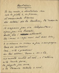 Manoscritto a matita grigia. 12 carte scritte a recto, numerate dall’Autore. Non sono presenti correzioni e cancellature. Su carta a righe (tranne l’ultima carta). Menabò per la stampa. Carte legate tra loro da uno spillo. Dimensioni: 210x170 mm. SI AGGIUNGE: Id., 3 componimenti autografi non firmati tratti dagli Idilli: Canto d’uccello, Nonno e nipotino, Il pagamento. Datati 1920-1921. Manoscritti a inchiostro nero. 4 carte. Con alcune correzioni e cancellature. Dimensioni: 210x170 mm. SI AGGIUNGE: Montebelo. Brano poetico autografo firmato. Datata ottobre 1925. Manoscritto a inchiostro nero. 4 carte scritte a recto. Brano dialettale. Con correzioni e cancellature. Al margine superiore sinistro traccia di spillo. Dimensioni: 210x170 mm. SI AGGIUNGE: Id., L’ordinanza. Brano poetico autografo. Non datato. Manoscritto a matita grigia. 2 carte scritte a recto. Brano dialettale. Con correzioni e cancellature. Su carta a righe. Dimensioni: 193x124 mm. I e II DOCUMENTO: I titoli del menabò sono i seguenti: Il nonno e il nipotino, La capra all’albero, Il pagamento, Canto d’uccello, Gli amanti, Il dono, Quadro di gusto antico, Amplesso, Amore giocante, Paesaggio. La raccolta di Virgilio Giotti Liriche e Idilli è stata pubblicata a Firenze, “Edizioni di Solaria” nel 1931. III DOCUMENTO: Montebelo venne pubblicata in Caprizi, canzonete e storie. E’ una poesia emblematica in cui Giotti descrive il quartiere vicino al centro di Trieste in cui si era stabilito a vivere e la sua progressiva urbanizzazione. IV DOCUMENTO: L’ordinanza è un piccolo quadro che mette in risalto attendenti innamorati burlati dalle donne di palazzo.