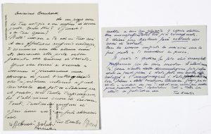 Manoscritti a inchiostro nero e blu. Scritte 3 pagine in totale. Su cartoncini, uno dei quali è un biglietto di auguri con un’opera di Greco, Il Buonpastore. Dimensioni varie. Missive relative ad un progetto di lavoro. Lo scultore scrive all’amico: «[…] Egli [Bellonzi] segnalerà 3 pittori (Pirandello, Guttuso, Cassinari) ed un grafico. Io […] avrei preferito non segnalasse me […]. E’ chiaro che Apollonio farà soltanto dei nomi di astratti. Non ho ancora iniziato le incisione, ma lo farò presto. […]» (19 gennaio 1962). «Ti comunico che da alcuni mesi sto lavorando alle porte della facciata de Duomo di Orvieto. Spero che verrai a vederle e insieme prenderemo una sbronza di quel vinello squisito che si produce intorno a quel miracolo di gotico italiano […]» (fine 1962).