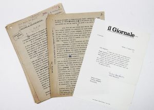 Dattiloscritto a inchiostro nero. Pagine 9 (numerate da Montanelli). Correzioni e firma a inchiostro blu. Altre note manoscritte di altra mano a matita grigia, blu e rossa. Dimensioni: 290x210 mm. SI AGGIUNGE: Lettera dattiloscritta con firma autografa. Datata 31 agosto 1974. Dattiloscritto a inchiostro nero e firma a penna blu su carta intestata “Il Giornale nuovo / Il Direttore”. Dimensioni: 290x210 mm. I DOCUMENTO: In queste pagine Montanelli narra la sua prigionia nel carcere di San Vittore e di Gallarate. Incipit del testo in prosa: «La prigione di Gallarate era, in origine, un deposito dell’aviazione. I tedeschi la tinsero di grigio scuro per mimetizzarla. Poi cominciarono a stivarci dentro i prigionieri. Mi ci condussero il 6 febbraio del ’44. Ma prima mi fecero fare una tappa a S. Vittore. A S. Vittore giunsi la sera del 5, e il pittore Carpi mi immatricolò […]». II DOCUMENTO: La lettera è inviata ad un collega: «Ci siamo resi conto che la rassegna della Stampa nazionale e quella della Stampa estera riescono molto meglio se fatte a più mani, essendo assolutamente impossibile che una sola persona possa leggerle tutte. […] Ti solleviamo da questo incarico […]. Penso che te ne sentirai sollevato […]».