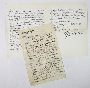 Manoscritti a inchiostro blu e nero. Scritte 5 pagine in totale. Una lettera su carta intestata “Il Popolo d’Italia” con fori di raccoglitore. Una busta conservata. Dimensioni varie. Nella lettera datata 1950 Sironi ricorda all’amico le difficoltà a trovare il suo recapito: «Roba che spiega la sciagurata vita degli uomini assai meglio della Bibbia e della storia […] Sono nella via del ritorno purtroppo a Milano perché ho molto da fare e qui è impossibile lavorare a tutta orchestra. De Luca voleva certo parlarmi della Giuria per un cartellone sportivo […]. Una causa imbastita finì in niente perché l’avvocato mi frenò a sua volta non so ben perché […]. Non ho [?] entusiasmo per tornare a Milano meglio tahiti dove ci sono almeno quelle dolci creature inghirlandate un po’ selvagge ma buone che ho visto nei quadri di Goghen [sic!]. Scrivi pure un articolo su tutto ciò se ne hai il coraggio. Ho fatto però il conto. Sarebbe il 28473 articolo che mi è stato offerto e che non ho mai visto. Bella Italia […]». L’altra lettera non datata è scritta dal “Popolo d’Italia” dove Sironi iniziò a lavorare come illustratore nel 1921. L’artista scrive: «[…] Io sono un vecchio orso senza illusioni ma qualche volta sono lieto di essere… stanato. […] Sono tempi tremendi questi a Milano mi pare si è lasciata un poco andare… […] il Popolo […] mi ha fatto quasi […] delle difficoltà […]. Proprio crepare. E’ la parola. Con che vedi c’ gente al mondo destinata a passarsela sempre male e sempre alla malora […]. Quanti bei ricordi e speranza lontane! Quante benemerenze per l’arte e relative medaglie splendono ora nel buio dell’arte moderna […]».