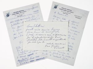 Manoscritto a inchiostro blu. Dimensioni: 108x163 mm. SI AGGIUNGE: Turcato Vanna, Lettera autografa della moglie del pittore e firmata anche da Turcato, inviata all’editore Prearo. Non datata. Manoscritto a inchiostro blu su carta intestata “Grand Hotel Leonardo da Vinci / Roma”. 2 carte. Dimensioni: 210x140 mm. I e II DOCUMENTO: Le missive sono relative alla pubblicazione di una monografia sul lavoro del pittore, uno dei principali esponenti dell’astrattismo informale italiano. Turcato scrive a Schettini: «Il mio amico Prearo deve farmi la monografia ti prego di essere a sua disposizione per le riproduzioni dei tuoi quadri, il che è molto importante per me e per te […]».