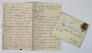 Manoscritto a inchiostro blu. Una busta conservata. Dimensioni: 180x114 mm. In totale 7 pagine scritte. La lettera del 21 maggio 1891 tratta del problema di salute della nipotina (figlia del fratello) e chiede il giudizio del Prof. Bizzozero, collega dell’amico. L’altra lettera, del 22 dicembre dello stesso anno, cita l’amico “Pin” – Giuseppe Giacosa – e il successo per un suo lavoro (evidentemente il dramma La Dame de Challant scritto per Sarah Bernhard).