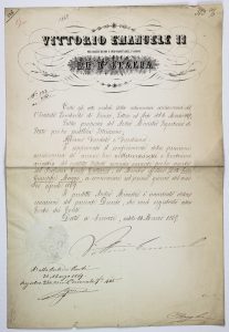 Vittorio Emanuele II di Savoia - Re d'Italia, Documento, con firma autografa, relativo al conferimento di una pensione accademica rimasta vacante dopo la morte di Carlo Cattaneo. Firenze, 14 marzo 1869.