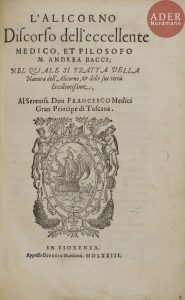 L’Alicorno. Nel quale si tratta della Natura dell’ Alicorno, & delle sue virtù Eccellentissime. Florence : Giorgio Marescotti, 1573.