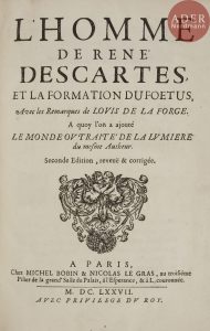 DESCARTES (René). L’Homme de René Descartes, et la formation du fœtus, Avec les Remarques de Louis de La Forge. A quoy l’on a ajouté Le Monde ou traité de la lumière du mesme Autheur. Paris : Michel Bobin, Nicolas Le Gras, 1677. —...
