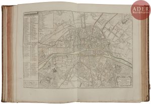 ♦ Ce bel atlas comprend une vue de la statue équestre de Louis XV place de la concorde, gravée par Le Charpentier d’après De Seve, un titre imprimé collé dans un cadre gravé, une carte de France avec la division des généralités, datée de 1766, 22 cartes représentant les différentes généralités de Paris, le plan général de la ville et faubourg de Paris, daté de 1762, et la carte de la « Nouvelle élection et environs de Paris » datée de 1766.