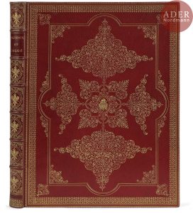 Maroquin rouge, plats ornés d’un petit fer doré central entouré d’un riche décor de volutes filigranées, de deux cadres lobés aux 4 points cardinaux et d’une large roulette dorée en encadrement à l’extérieur, dos à nerfs richement orné, dentelle dorée intérieure, tranches dorées, étui boîte à coulisse de maroquin vert sombre (Capé).