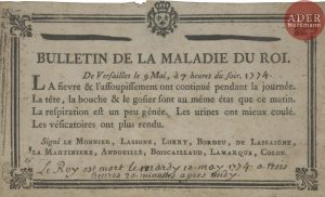 ► Placard de la plus grande rareté publié à Versailles le 9 mai 1774, à 7 heures du soir, la veille de le mort de Louis XV.