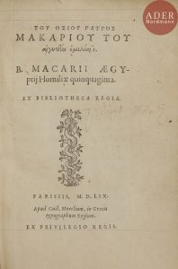 Édition Princeps en grec de ces Homélies spirituelles, imprimée à l’aide des caractères « grecs du roi » par Guillaume Morel.
